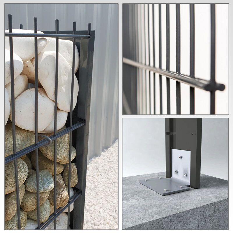Gabionenzaun bestehend aus flachen, geschweißten Paneelen mit einer Breite von 250 cm und optionaler Höhe / Das Produkt umfasst: • 2 Stück 2D-Paneele (verzinkt + PVC, RAL 7016, Maschenweite 50x 200 mm) • 2 Stück Stahlpfosten aus 2 mm Stahl (Breite: 19 cm, Höhe = Höhe des gewählten Paneeltyps +60 cm), 2 Stück Pfostenhalterung + Clips, oder doppelseitige Haken aus 3,5 mm Draht (die Anzahl der Stück richtet sich nach der erforderlichen Höhe des Paneels)/